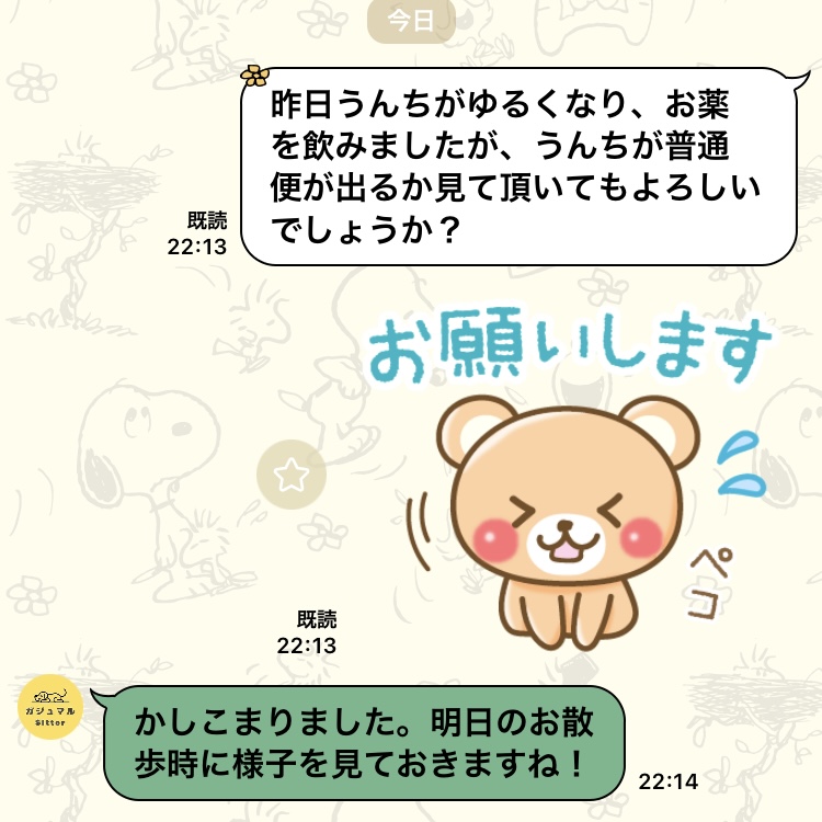 →シッティング前日、お世話する子の体調の確認や変更点がないか確認のメールをさせて頂きます。体調の変更点などありましたら教えていただければと思います。