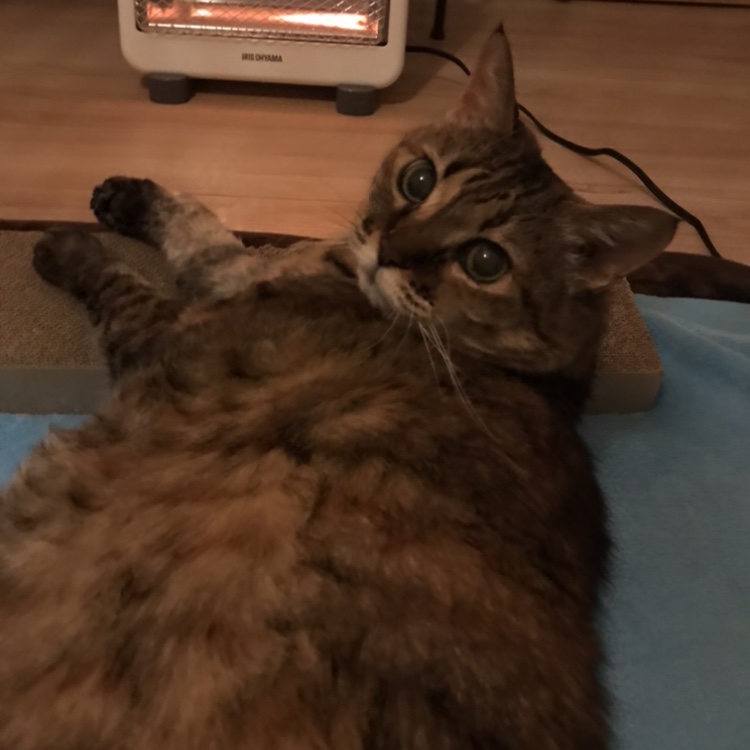 ストーブでまったりあたりながら、お腹を出して、『撫でて…』とおねだりのもこちゃん。