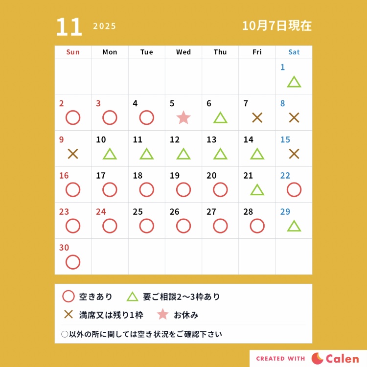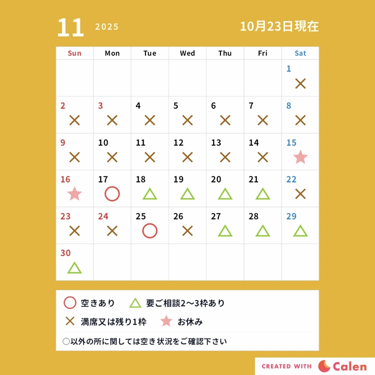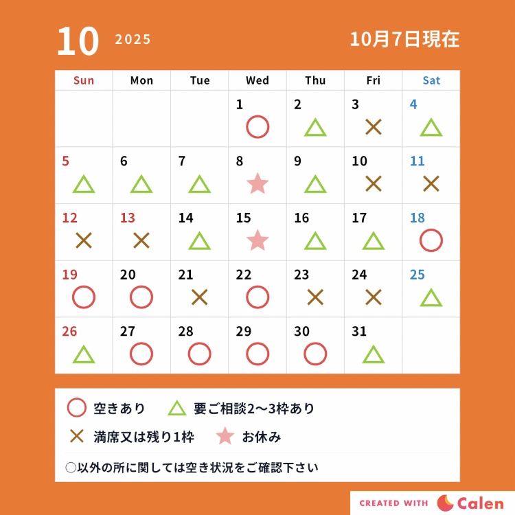 △は空きがありますが、時間についてはお問い合わせお願い致します。
